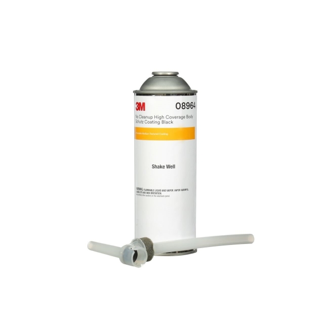 Tough, fast drying, paintable, rubberized undercoating material that effectively protects and sound deadens door skins, quarter panels, wheel wells, frame rails, trunks and fenders. Use with 08801 applicator gun. Supplied with an assembled plastic dip tube that is inserted into the can and fits directly onto the 3M(TM) No Cleanup Applicator Gun 08801. Because of the disposable dip tube/nozzle, no product comes in contact with the gun, and no cleaning is required. One 24 oz can covers up to 43% more area than conventional 32 oz offerings. The texture is medium to coarse, high build. It is paintable when dry.
