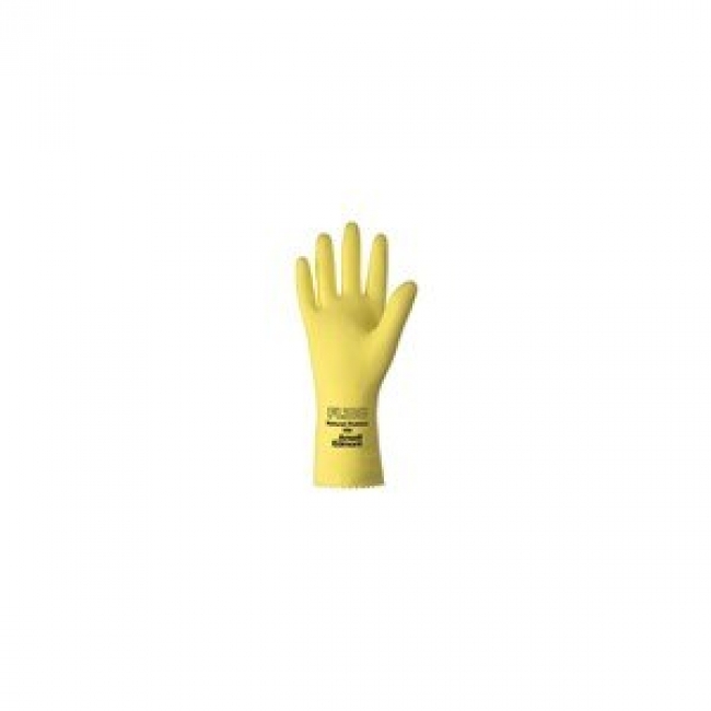 - Ansell FL100 Gloves, Product Code: 185751, Color: Lemon yellow, Type: Fishscale grip, Gauge: 17 mil, Style: 12" pinked cuff, Packaging Qty: 12 pr per polybag - 12 bags per case, Size: 9